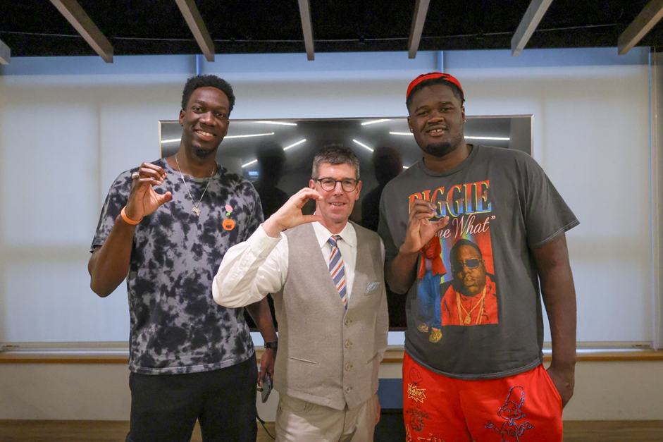 Michal Jäckel 教授(中)演講結束後,與本校雄鷹籃球球員波波卡(右)、莫斯塔發(左)討論並合照。(照片來源:運動學程)